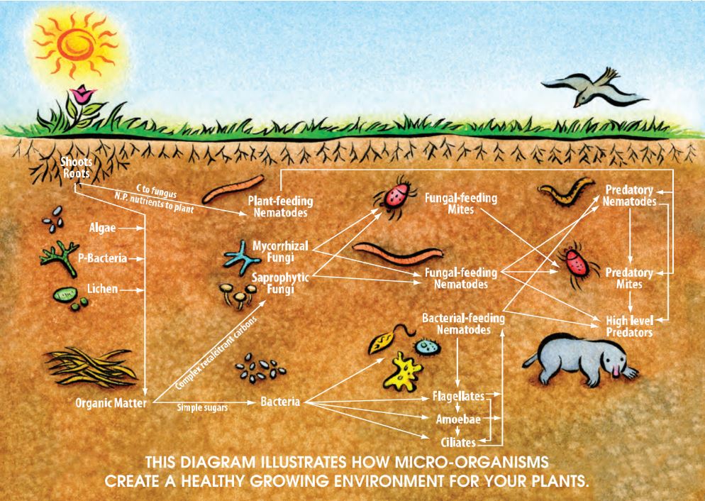 The soil food web is like the terrestrial food web. It is a community involving predators and prey, with all players needed for a healthy ecosystem. Bacteria and fungi make up the base of the food-web, feeding on exudates (carbohydrates and sugars) put out by the plant, in a symbiotic relationship. Bacteria and fungi are responsible for making glues and binding microaggregates together to increase pore spaces, oxygenating plant roots and retaining more water in drought conditions. These bacteria and fungi also chip away at organic matter and sand/silt/clay, breaking chemical bonds and making nutrients available to plants. But it is only when they are fed upon by predators, that the nutrients are released. This all happens in the rhizosphere, in quantities and qualities dictated by the plant!