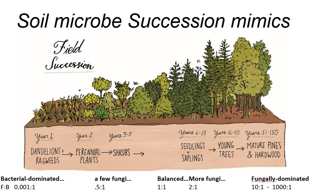 Plants are associated with certain microbial communities. Grasses are composed of bacterially-dominated soils, and forests are composed of fungally-dominated soils. This is the way plants co-evolved with soil microbes, and the pattern we aim to mimic when we restore soils with biology. That is why it is important to use a microscope to understand the proportion of fungi to bacteria (also known as the fungal to bacterial ratio, F:B).
