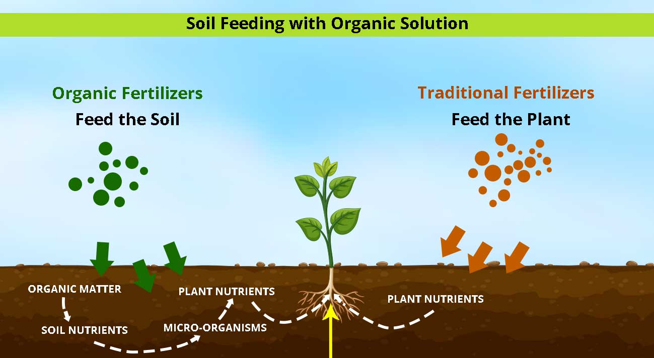 In a natural system, where organic matter is broken down by microbes which releases soluble nutrients in the rootzone slowly, plants must work for their food. They put out up 40% - 50% of the energy they obtained through photosynthesis in to the soil in the form of root exudates, to feed soil microbes, which in turn feed the plant. Plants growing this way have larger root systems, better access to micro-and-macro nutrients, and increased pest resistance and drought tolerance, than plants grown with chemicals. No excess nutrients are created and leeched away.