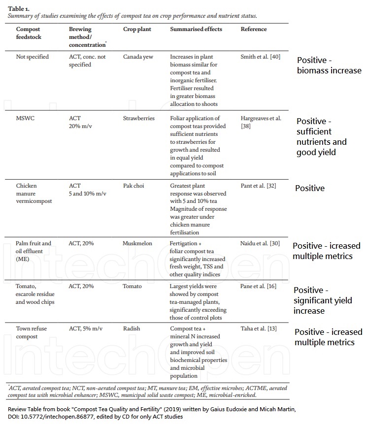 The following table by Eudoxie and Martin (2019) summarizes the effects of actively aerated compost tea (ACT) on various crop plants from several different studies. The responses of a properly made compost tea were always positive.